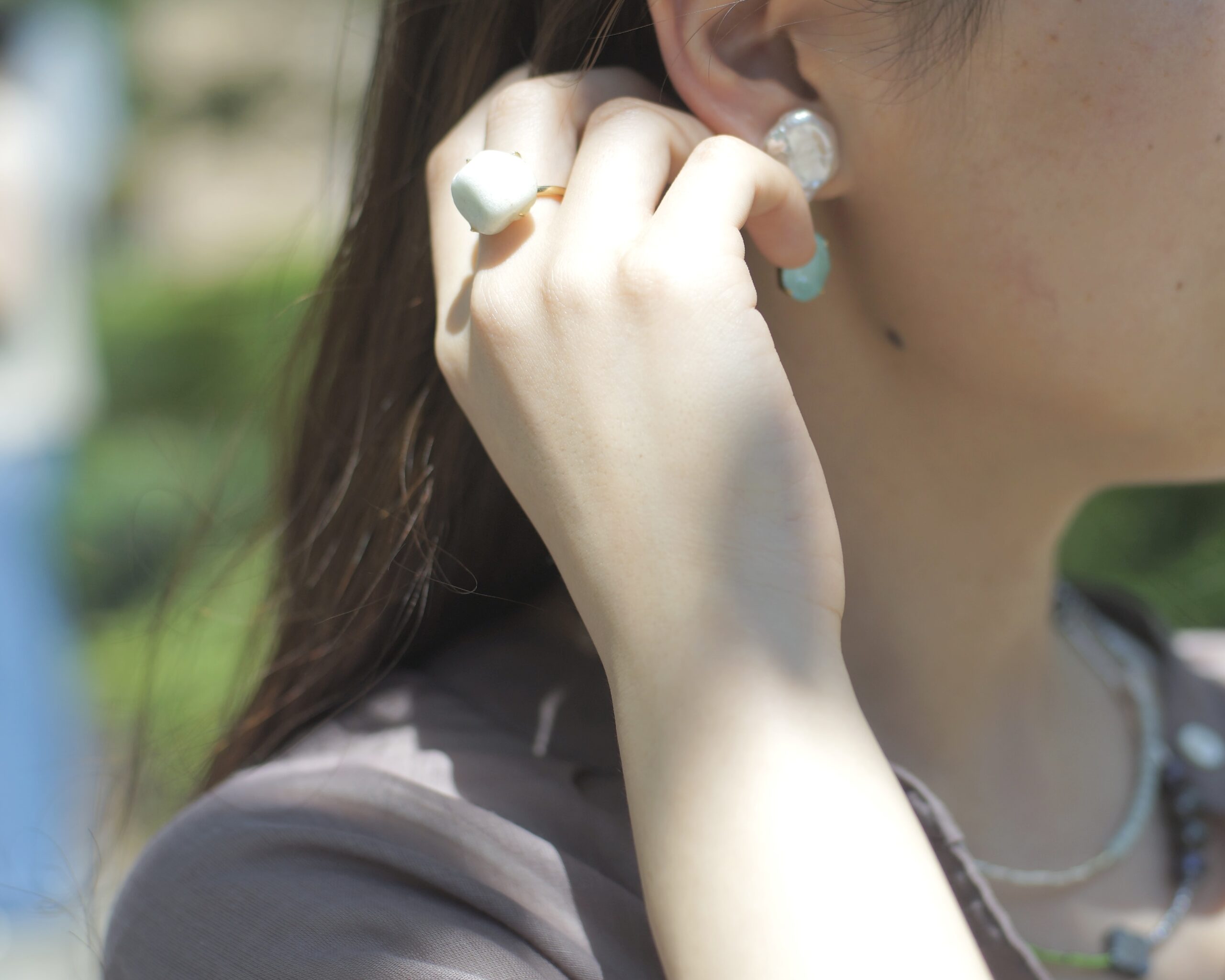 天然石の有機的な色彩や造形の美しさと、輝きを活かしたデザインや、使われなくなったボタンをアップサイクルで